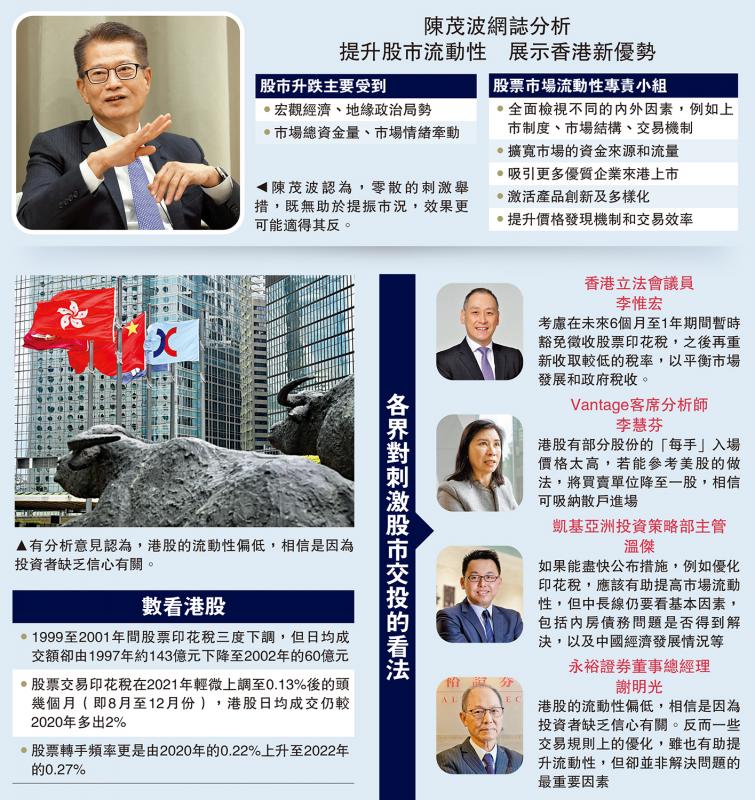 陈茂波认为,要改善股市表现,关键在于投资者对后市预期向好,这关乎到入市的资金量和流向,取决于经济表现、公司业绩、是否持续有具潜力的企业上市等。这些都不是单纯靠下调股票交易印花税就可以达至的效果。他续称,股市升跌也受地缘政治和市场情绪所左右,西方的政治成见所造成的误解,也干扰到投资者对本港和内地股市的信心。