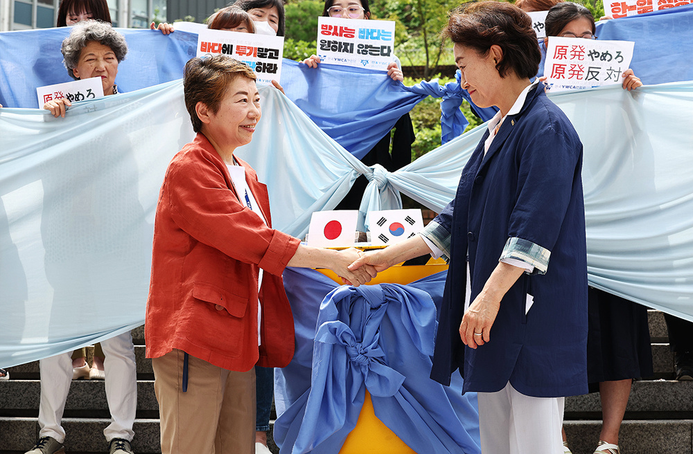 2023年7月10日,韩国首尔中区,在明洞大教堂前的台阶上举行的阻止福岛污水排放韩国-日本YWCA联合记者会上,韩国YWCA联合会会长元英姬(Won Young-hee)(右)和日本YWCA会长藤谷佐子(Satoko Fujitani)握手。