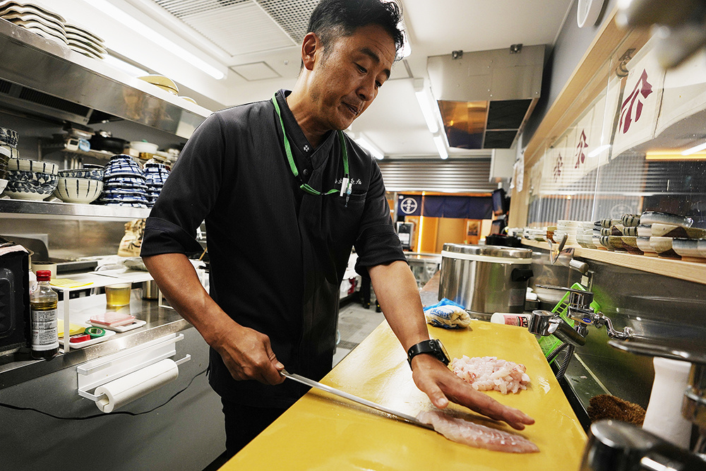 2023年7月13日,日本福岛县磐城市,一家鱼店兼餐馆的老板Katsumasa Okawa在他的餐馆里切比目鱼肉。Katsumasa Okawa说,受损福岛核电站的装有污水的水箱比核废水排海更让他烦恼。他希望能尽快将它们清除,尤其是在几年前他访问核电站时看到“巨大的”水箱占据了大部分厂区之后。