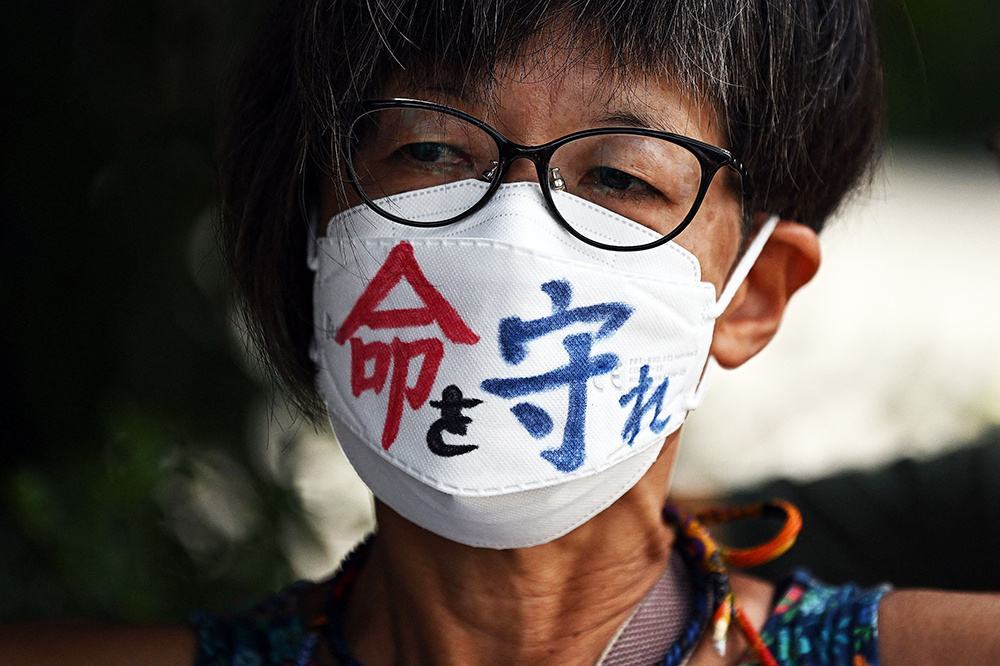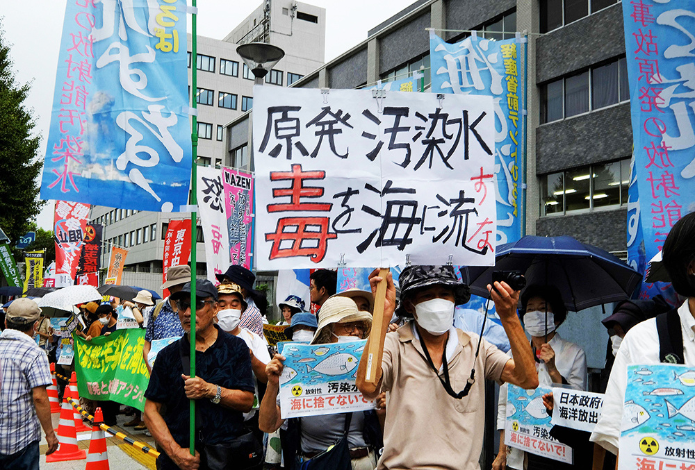 2023年8月22日,日本东京,一名抗议者(中)在首相官邸外举着“不要向海洋排放受污染的水”的标语,抗议日本政府计划将福岛第一核电站处理后的废水排放到海洋中。日本首相岸田文雄8月22日宣布,将从8月24日开始向太平洋排放福岛核电站的废水,遭到了渔民的反对。
