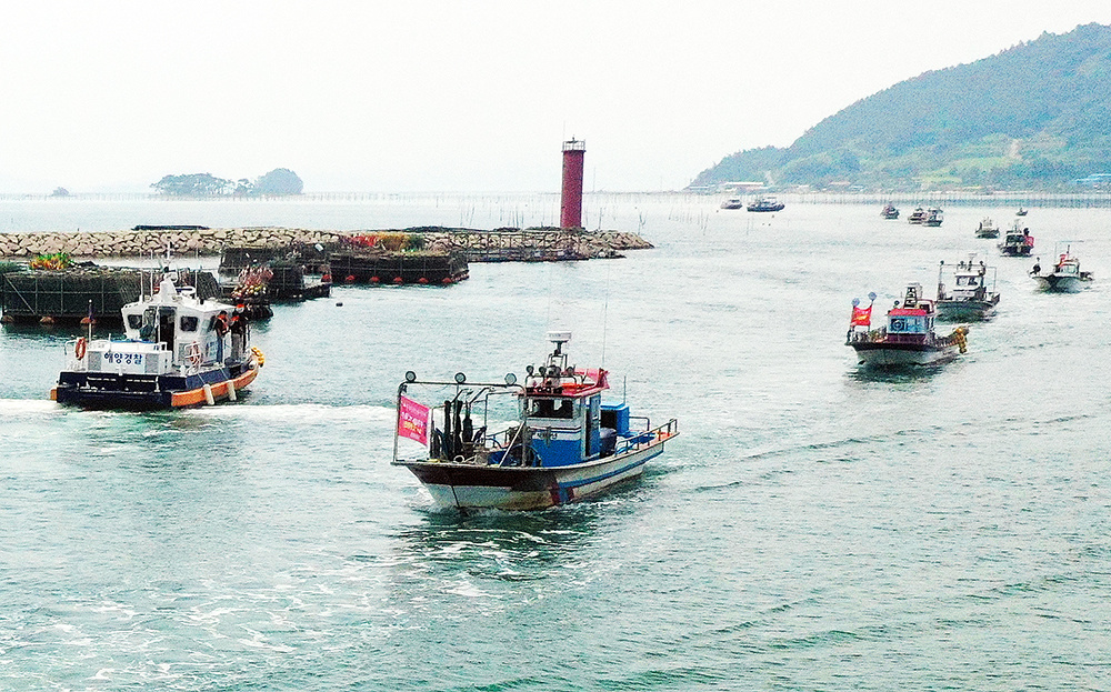 2023年7月21日,韩国全南郡,韩国渔民会总联盟全南道支会的相关人士继续在海上进行示威,反对日本核污水排海。