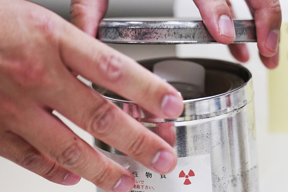 2023年7月19日,日本东京,东京大学放射学家Katsumi Shozugawa拿着从福岛第一核电站泄漏出来的含有氚、铯和其他放射性核素的地下水样本。