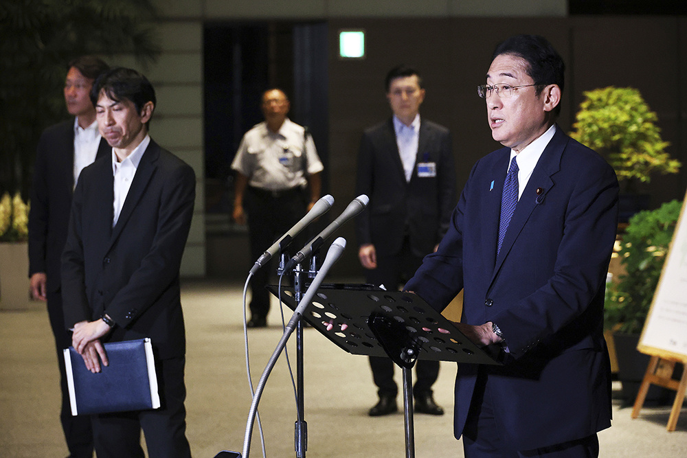 2023年8月21日,日本东京,首相官邸,日本首相岸田文雄和全国渔业协会联合会会长坂本雅信举行会议,讨论将东京电力公司控股的福岛第一核电站处理后的水排放入海的计划后,向媒体发表讲话。