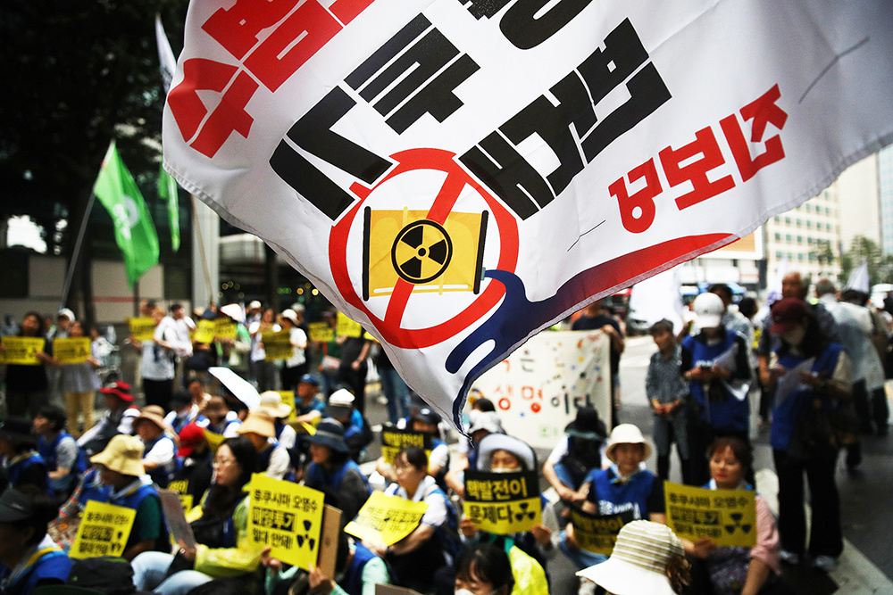 2023年8月12日,韩国首尔,韩国抗议者参加了一场集会,反对日本政府计划将受损的福岛核电站的放射性废水排放到太平洋。2023年夏天,日本不顾亚洲邻国的强烈抗议,将福岛第一核电站处理过的污水排入太平洋。